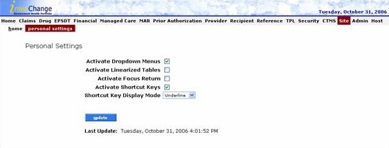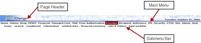 Beneath the main menu bar is the submenu of horizontal links that open an associated page within the system. The submenu links appear in the same order as the main menu pull-down options, and the submenu links are spelled the same as the main menu pull-down options.