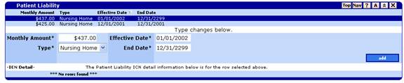 If the user clicks once on a search result row, the associated information panel opens. In the following figure, the user clicks the first row of the Recipient Patient Liability panel and detailed information displays at the bottom of the panel.