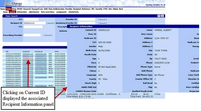 Within certain search panels, the user can also click hot links to see additional information. If the fields in a column are underlined, there is a hot link available.