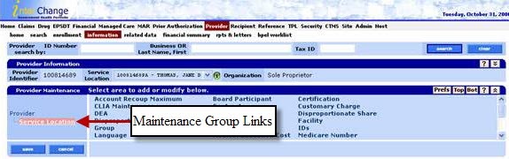 The following image demonstrates maintenance group links (Provider and Service Location) and the associated maintenance item links.