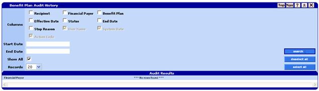 Audit panels display data change history for a given navigator item panel. Every insert, update or delete that is performed (on an updatable panel) in the system causes a before image of the data to be saved to the audit table. Users can then use the audit panel to display this information.